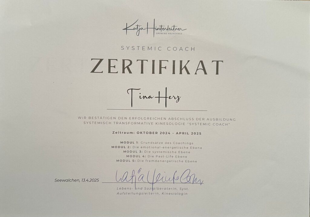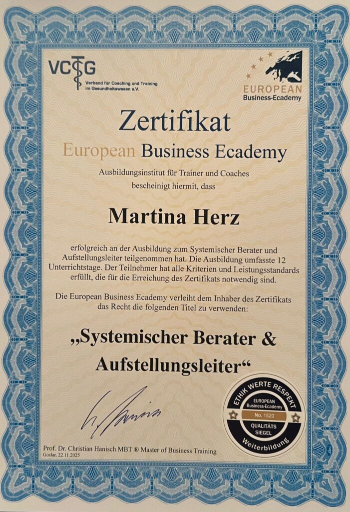 Stillstand gibt es für mich nicht. Um Sie bestmöglich zu unterstützen, bilde ich mich stetig weiter. Ich bin davon überzeugt: Geklärte Systeme sind die Voraussetzung für Erfolg und ganzheitliche Gesundheit.
